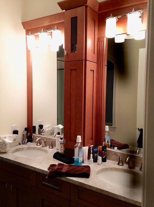 After purchasing a brand new condominium, it didn’t take long for the “smoke and mirrors” to disappear. Despite ample space, this master bath lacked style and function for a client with modern and high end taste. The existing marble floor was maintained given the client’s color preference for grey. I chose to create a brick patterned feature wall with charcoal ripple textured tiles. A cramped double sink with an obtrusive counter-mounted storage unit made for a very tight working area every morning and night. The frameless oversized shower helped the room breathe but cantilevering the vanity added expansive depth and openness to the room. The custom cabinet crafted out of charcoal stained ash is a harmonious contrast to the fog color flooring. Finishes are sleek stainless steel hardware, satin nickel sconces and wall mounted “cross” nickel faucets the deep dark grey vessel sink completes the classic modern scheme.